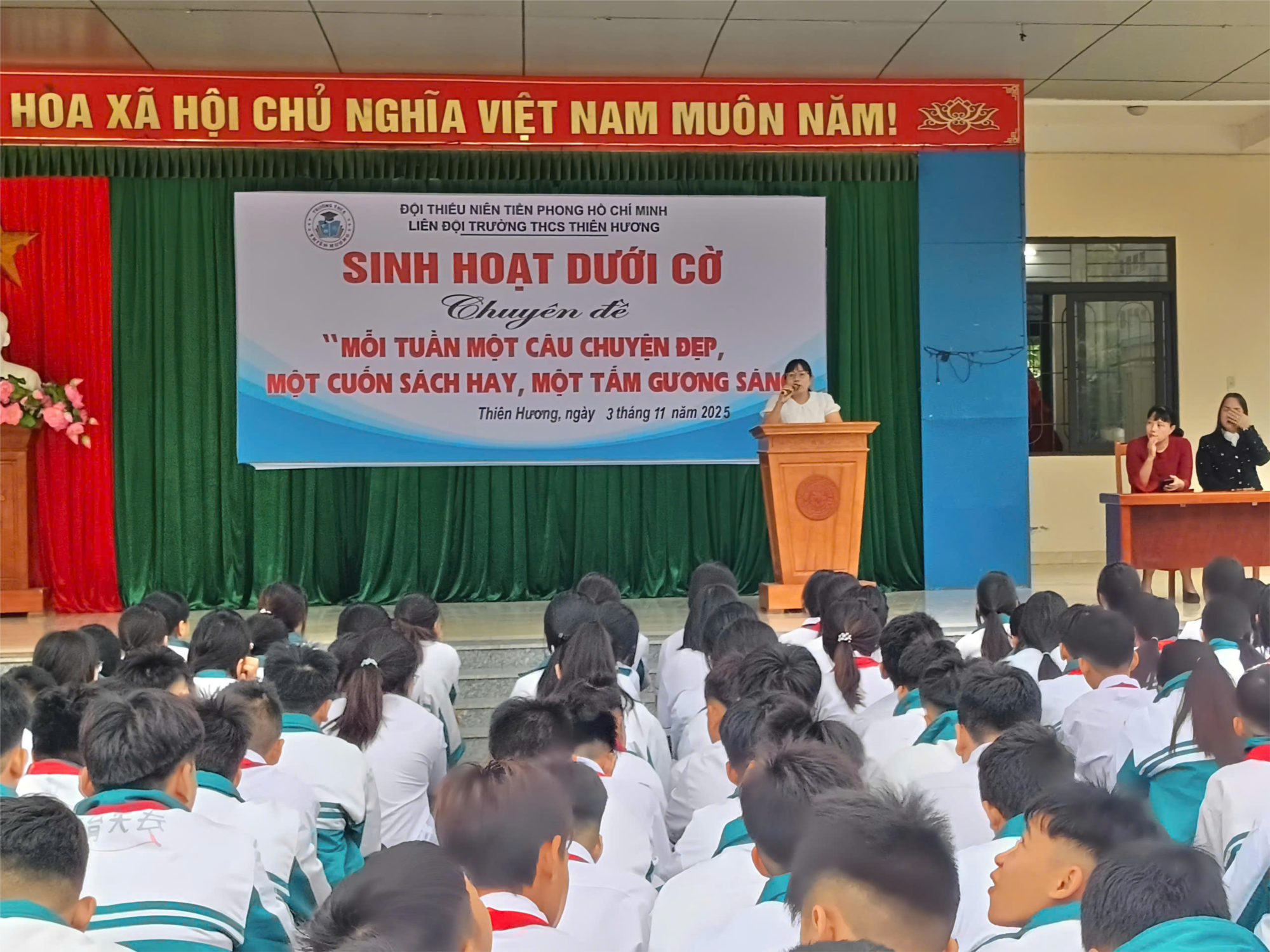 Thực hiện chương trình công tác Đội và phong trào thiếu nhi năm học 2025-2026, sáng nay _ thứ 2 ngày 3/11/2025, Liên Đội trường THCS Thiên Hương tổ chức Sinh hoạt dưới cờ, tổng kết các hoạt động trong tháng 10 và triển khai kế hoạch tháng 11.